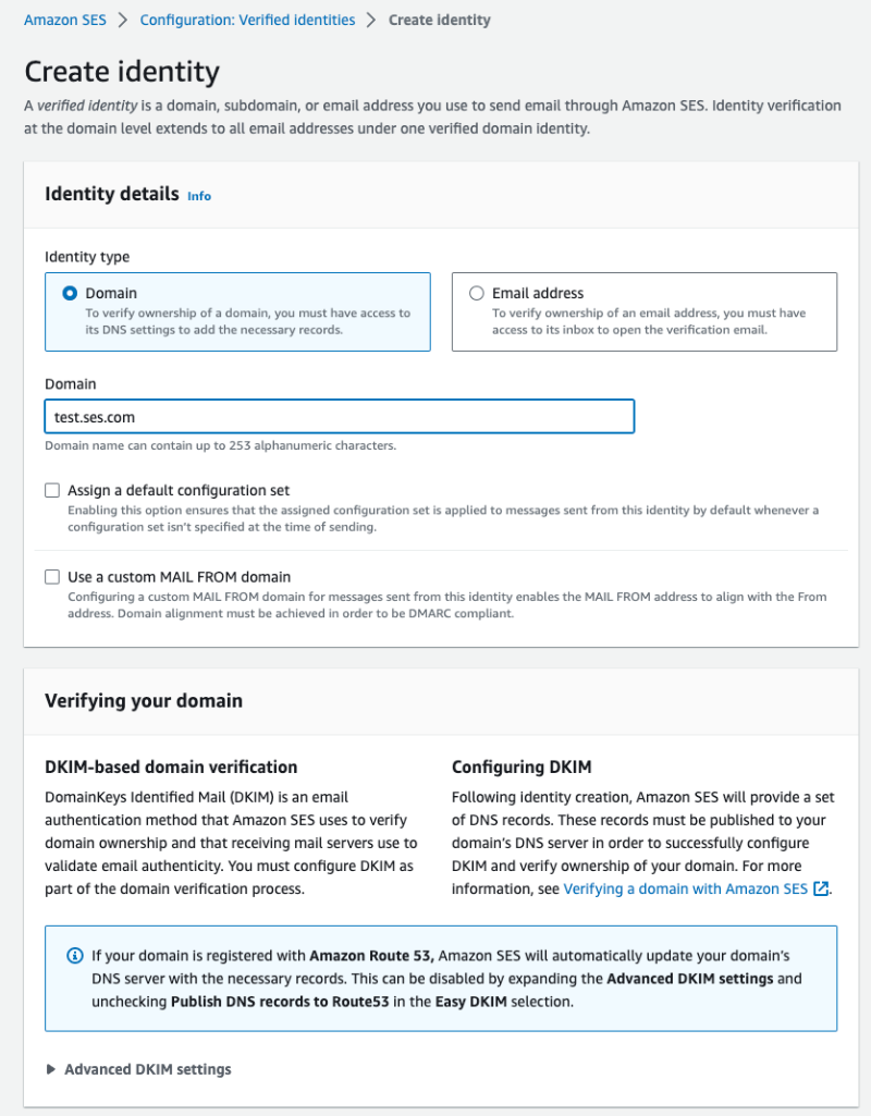 Amazon SES > Configuration: Verified identities > Create identity 로 이동하여 identity 를 생성한다.