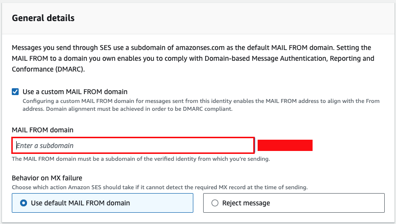 MAIL FROM domain 에는 예시에서 사용된 test.ses.com 의 subdomain 을 지정한다. ex) send.test.ses.com