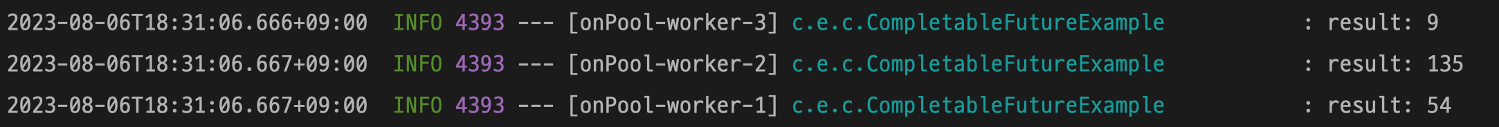 public void taskParallelThenAccept() { List<List<Integer>> list = Arrays.asList( Arrays.asList(1, 2, 3), Arrays.asList(4, 5, 6), Arrays.asList(7, 8, 9) ); List<CompletableFuture<Void>> completableFutureList = list.stream().map(subList -> CompletableFuture .supplyAsync(() -> subList.get(0) + subList.get(1)) .thenApplyAsync(plusValue -> plusValue * subList.get(2)) .thenAcceptAsync(result -> log.info("result: {}", result)) ).toList(); completableFutureList.forEach(CompletableFuture::join); }