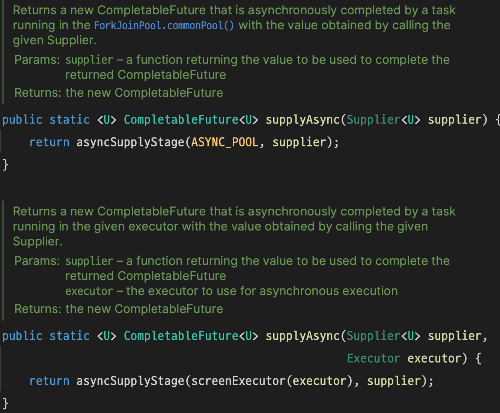 Supplier (functional interface) 를 파라미터로 전달 받아 Supplier 를 실행하고 Supplier 가 리턴하는 타입을 generic 타입으로 하는 CompletableFuture 를 리턴한다. 정의는 아래와 같다.