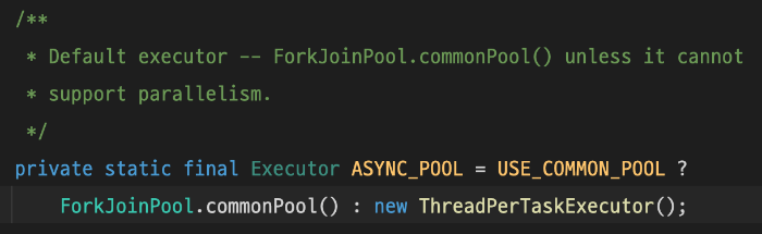 thenApply(fn) 의 경우 CompletableFuture 에 의해 정의된 스레드에서 fn 을 실행하므로 어느 스레드에서 실행되는지 알 수 없지만 thenApplyAsync(fn) 의 경우 일반적으로 ForkJoinPool.commonPool() 내의 스레드에서 fn 이 실행된다.