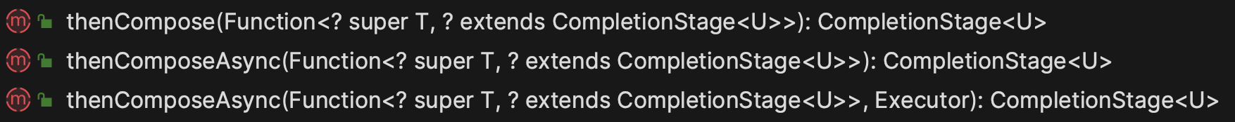thenApply 와 동일하게 Function (functional interface) 를 파라미터로 전달 받지만 Function 의 리턴 타입이 U 타입이 아닌 CompletionStage<U> 타입이라는 점이 다르다. 즉 Function 에서 정의하는 리턴 타입이 CompletableFuture 타입으로 리턴되어야 한다. stream 의 flatmap 과 비슷하다고 생각하면 좋다.