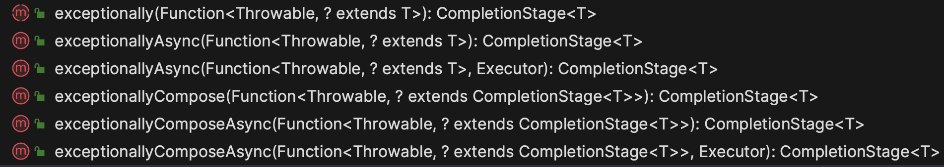 처리도중 발생한 예외 처리에 대한 핸들링을 할 수 있다. Function<Throwable, ? extends T> 로 정의된 functional interface 를 정의하여 사용한다.