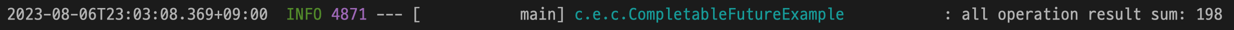 CompletableFuture 를 통해서 실행한 결과는 2초가 소요되었지만 순차적으로 실행한 결과는 6초가 소용됨을 알 수 있다. 위 예시에서는 thenApply 를 통해서 plus -> multiple 로 로직이 흘러간다.