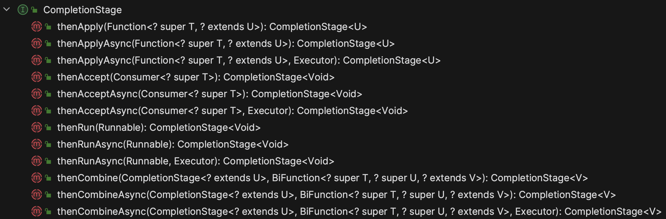 CompletionStage 에서 제공하는 대표적인 메소드는 아래와 같다.