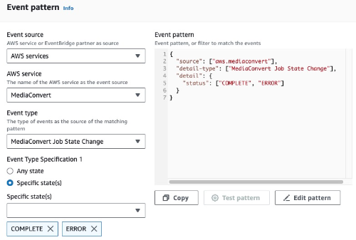 Event pattern 섹션에서는 Specific state(s) 항목에 COMPLETE, ERROR 를 선택하여 MediaConvert Job 이 정상적으로 완료된 경우와 에러가 발생한 경우에 대해서만 SNS 이벤트를 발생시키도록 설정하였습니다.