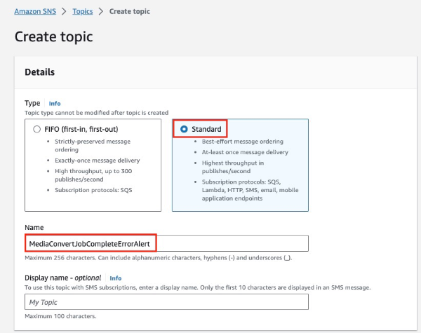 첫번째로 MediaConvert 의 Job 완료 메시지를 수신하기 위해서는 우선 AWS SNS 토픽을 생성해야 합니다. 이때 생성하는 토픽 타입은 Standard 로 설정해야 합니다.
