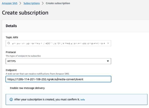 생성된 MediaConvertJobCompleteErrorAlert 토픽 상세 페이지 하단에 [Create subscription] 을 통해서 subscription 을 생성합니다. 생성 전에 SNS 구독 생성 이벤트를 수신할 API 서버가 실행되고 있어야 합니다.