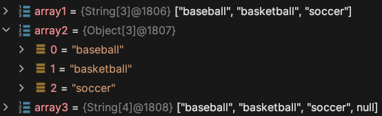 방법3은 ArrayList 보다 사이즈가 큰 배열을 파라미터로 넘겼을 때 ArrayList 의 각 요소는 배열에 복사되지만 ArrayList 보다 더 큰 index 의 값에는 null 이 채워짐을 보여주기 위해서 추가하였다.