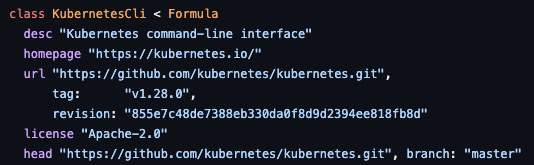 https://github.com/Homebrew/homebrew-core/blob/master/Formula/k/kubernetes-cli.rb 파일을 보면 아래와 같이 기본 kubernetes-cli 는 v1.28.0 버전을 설치함을 알 수 있습니다.