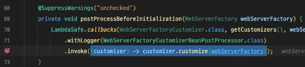 먼저 WebServerFactoryCustomizerBeanPostProcessor클래스에서 postProcessBeforeInitialization내 코드에 브레이크 포인트를 걸어서 추적을 시작해 본다.