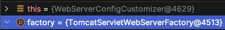 customize() 메서드 파라미터로 전달된 factory는 WebServerFactoryCustomizerBeanPostProcessor의 postProcessBeforeInitialization(WebServerFactory webServerFactory)에 주입된 TomcatServletWebServerFactory와 동일 함을 알 수 있다.