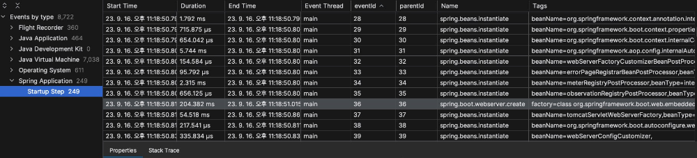 Spring Boot 2.4부터 ApplicationStartup 메트릭을 생성할 수 있게 되었다. 해당 메트릭에는 시작 과정에서 생성되는 각각의 이벤트와 라이프사이클이 처리되는 소요 시간 정보도 포함되어 있어 어느 부분에서 지연이 발생되는지도 확인할 수 있다.