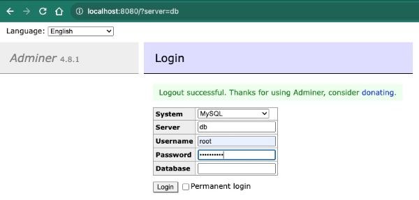 adminer는 mariadb 콘솔 도구이며 필수로 설치해야 하는 것은 아니다. 로컬 서버로 동작하며 브라우저에서 localhost:8080으로 접속하면 root 인증 후 DB에 접속할 수 있다.