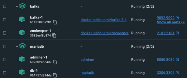 로컬에서 테스트 환경 구성을 위한 mariadb, kafka docker compose다. docker 엔진이 설치되어 있어야 하며 macOS(arm64) 환경에서는 이상 없이 동작하는 것을 확인하였다. 로컬에 테스트를 위한 환경 구성이기 때문에 가장 기본적인 설정만으로 구성된다.