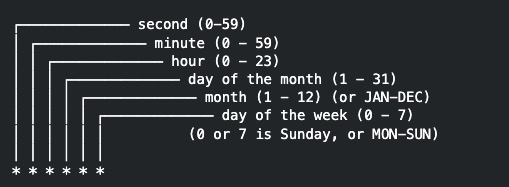 All Spring cron expressions have to conform to the same format, whether you are using them in @Scheduled annotations, task:scheduled-tasks elements, or someplace else. A well-formed cron expression, such as * * * * * *, consists of six space-separated time