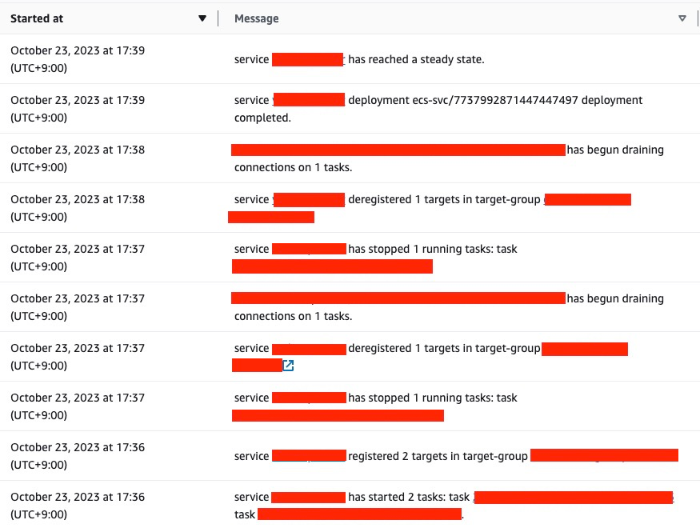 bitbucket repository에 코드를 commit 하고 pipeline 수행이 완료된 후 AWS ECS에서 배포 로그는 다음과 같다.
