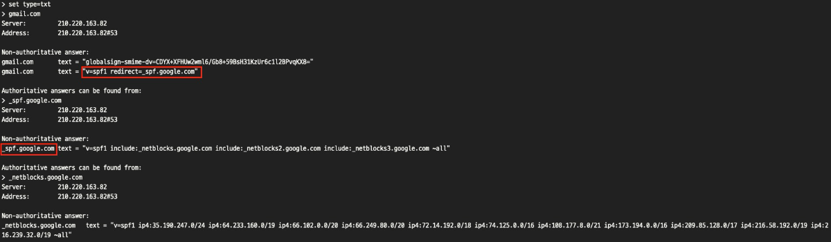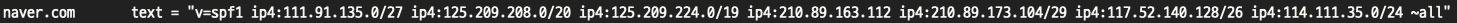 - 2번에서 얻은 TXT 레코드 중에서 레코드 헤더가 "v=spf1"으로 시작하는 레코드를 선정. "v=spf1"으로 시작되는 레코드를 찾을 수 없는 경우 "None"을 결과로 처리.