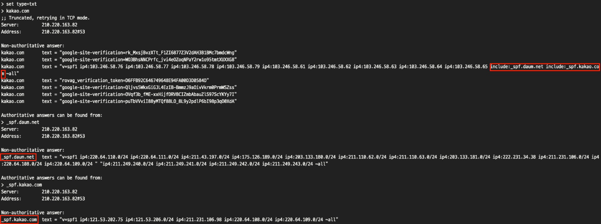 - 아래는 kakao.com 도메인에 대한 SPF 레코드 확인이다.