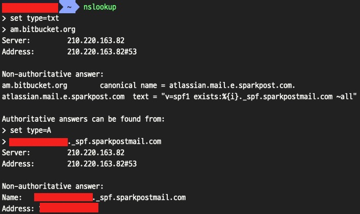 - 아래는 am.bitbucket.org 발송 도메인에 대한 SPF 레코드 확인이다.