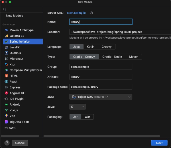 library 디렉토리에 Maven 또는 Gradle 빌드 도구를 구성한다.
